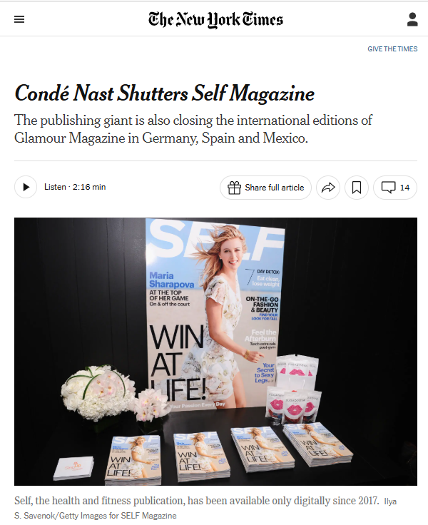 "Condé Nast Shutters Self and Glamour Editions" (The New York Times)